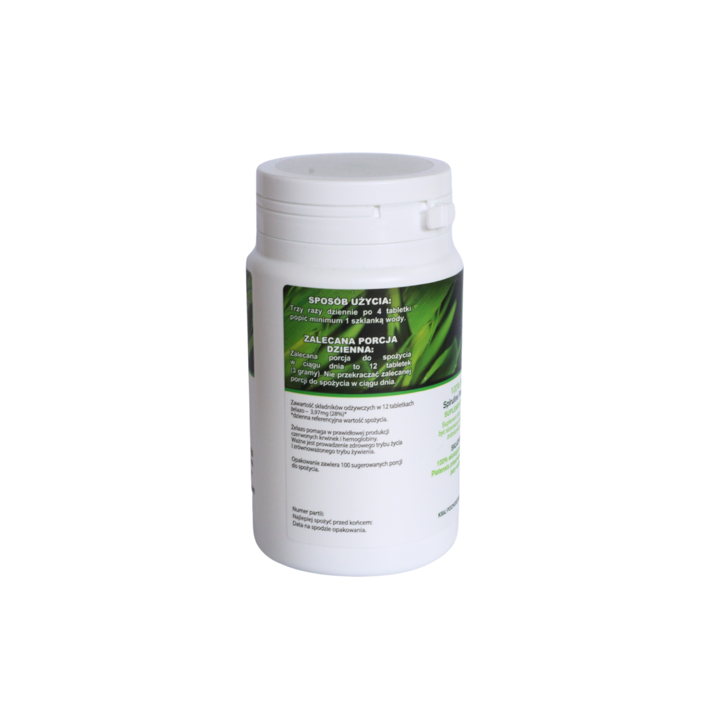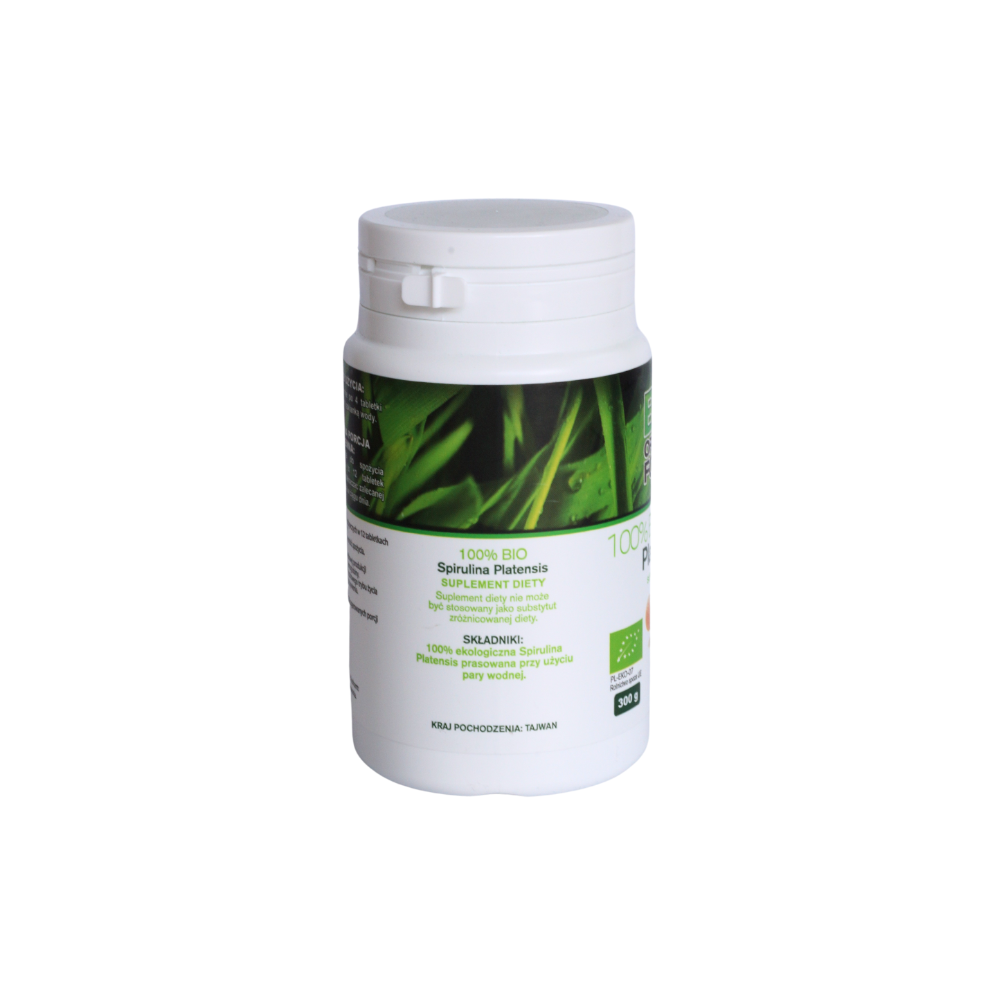 Składniki: 100% ekologiczna spirulina platensis prasowana do postaci tabletek przy użyciu pary wodnej.