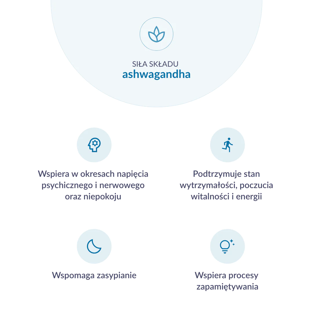 Ashwagandha ułatwia zasypianie, a przy tym pomaga zapewnić wysoki poziom energii i maksymalne skupienie w ciągu dnia.