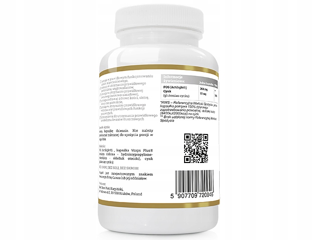 SKŁADNIKI: FOS (Actilight®), kapsułka VCAPS® (celuloza roślinna – hydroksypropylometyloceluloza – składnik otoczki), cynk (glukonian cynku).