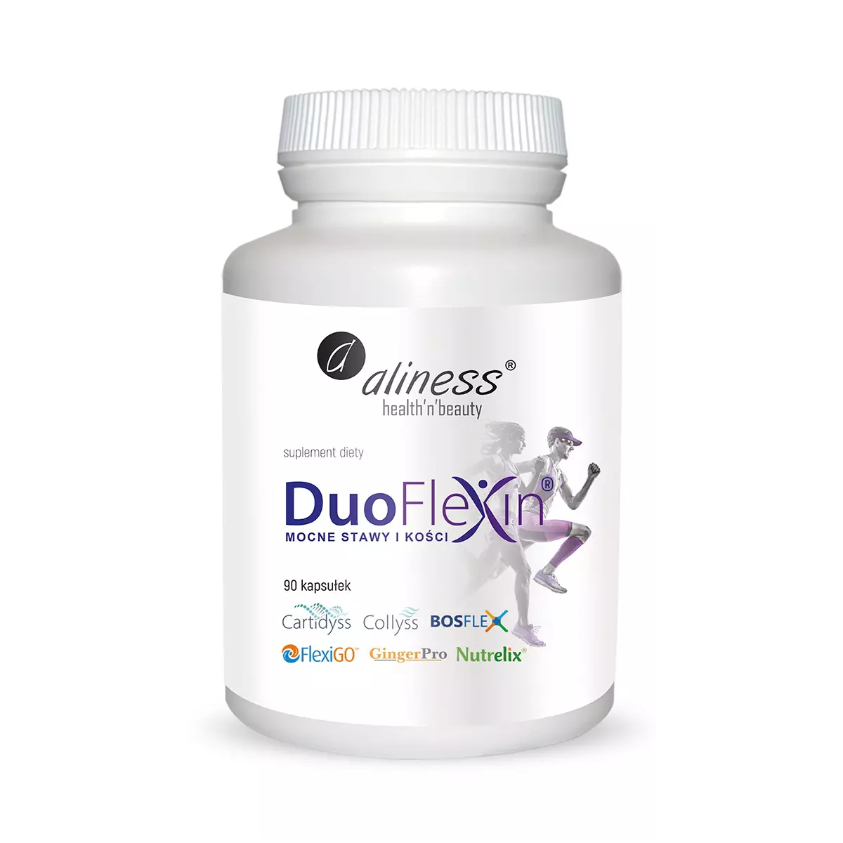 Duoflexin® posiada dwa rodzaje kolagenu pochodzenia rybiego – występujący naturalnie w ścięgnach i kościach kolagen typu I Collyss™ oraz kompleks kolagenowy CARTIDYSS™, zawierający w swoim składzie kolagen typu II – naturalnie występujący w chrząstce stawowej, a także naturalną chondroitynę i glukozaminę, wzmocnione dodatkową porcją niskocząsteczkowego kwasu hialuronowego o wysokiej przyswajalności oraz proteinami ze śluzu ślimaka. Ponadto kompozycję wzbogacono o synergistycznie działające składniki: