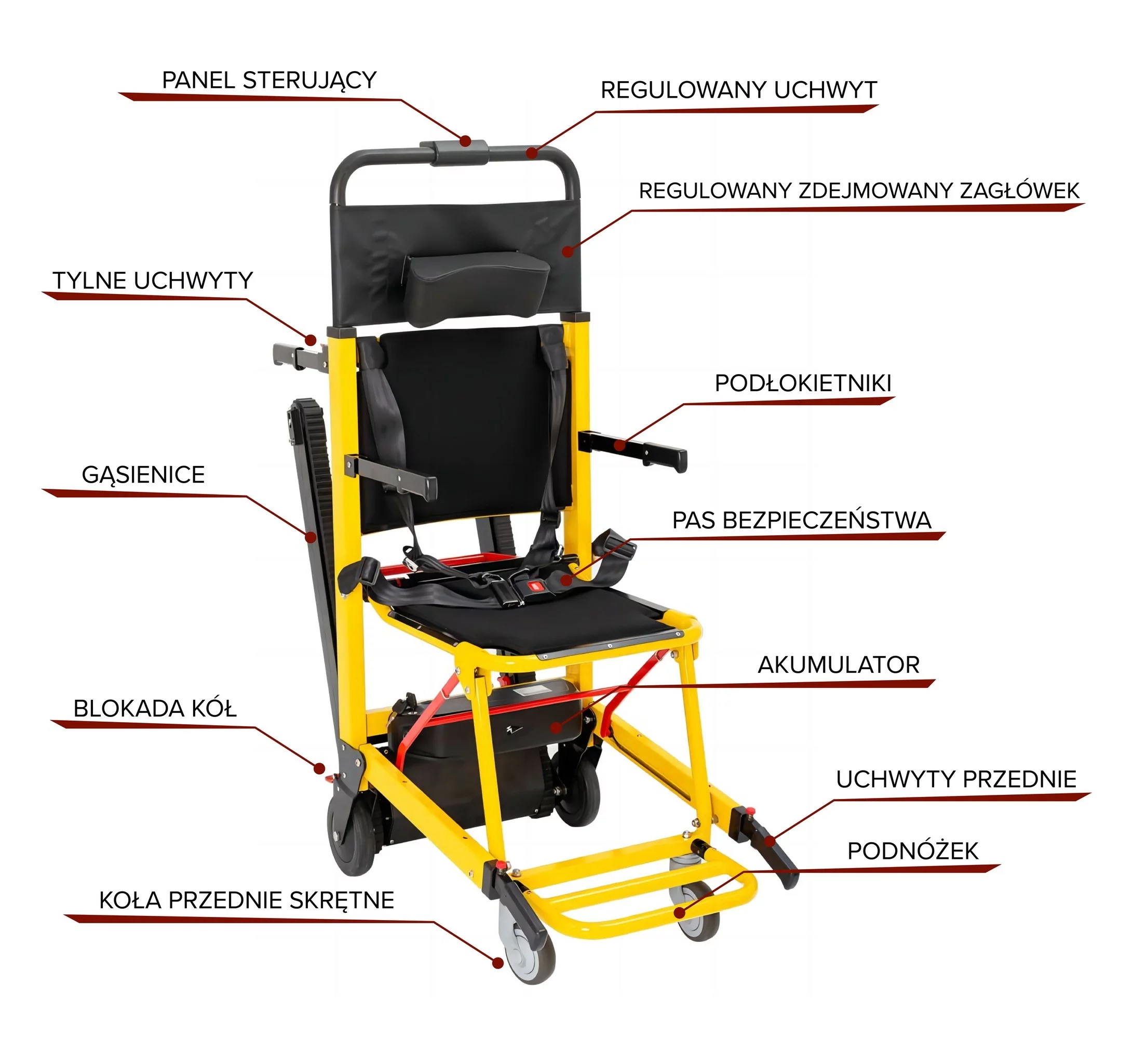✅ Napęd elektryczny uskutecznia transport/ewakuację osoby o ograniczonej mobilności zarówno w dół, jak i w górę po schodach