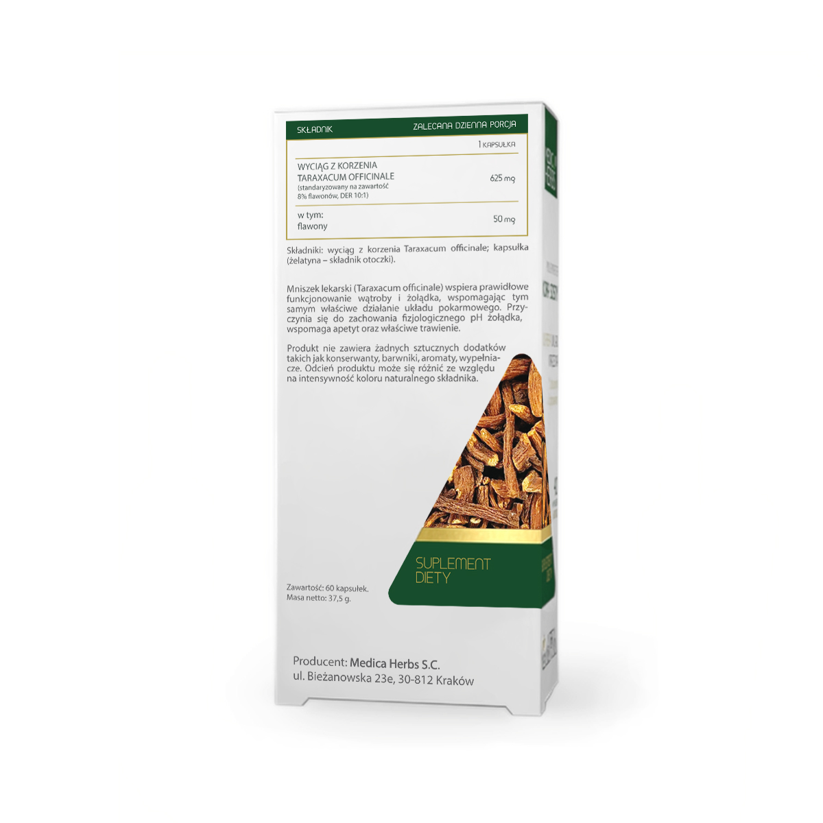 ✅ Każda kapsułka zawiera 625 mg wyciągu z ziela Taraxacum officinale (50 mg flawonów).