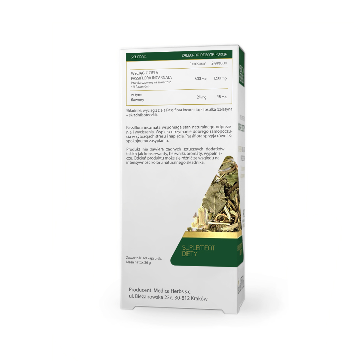 ✅ Każda kapsułka zawiera 600 mg wyciągu z ziela Passiflora incarnata (24 mg flawonów).