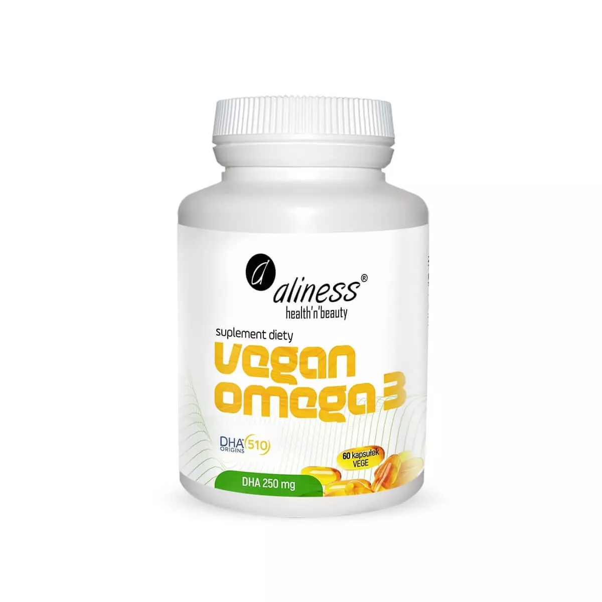 ✅ Każda kapsułka Vegan Omega-3 dostarcza 250 mg niezbędnych kwasów omega-3, w postaci kwasu dokozaheksaenowego (DHA).