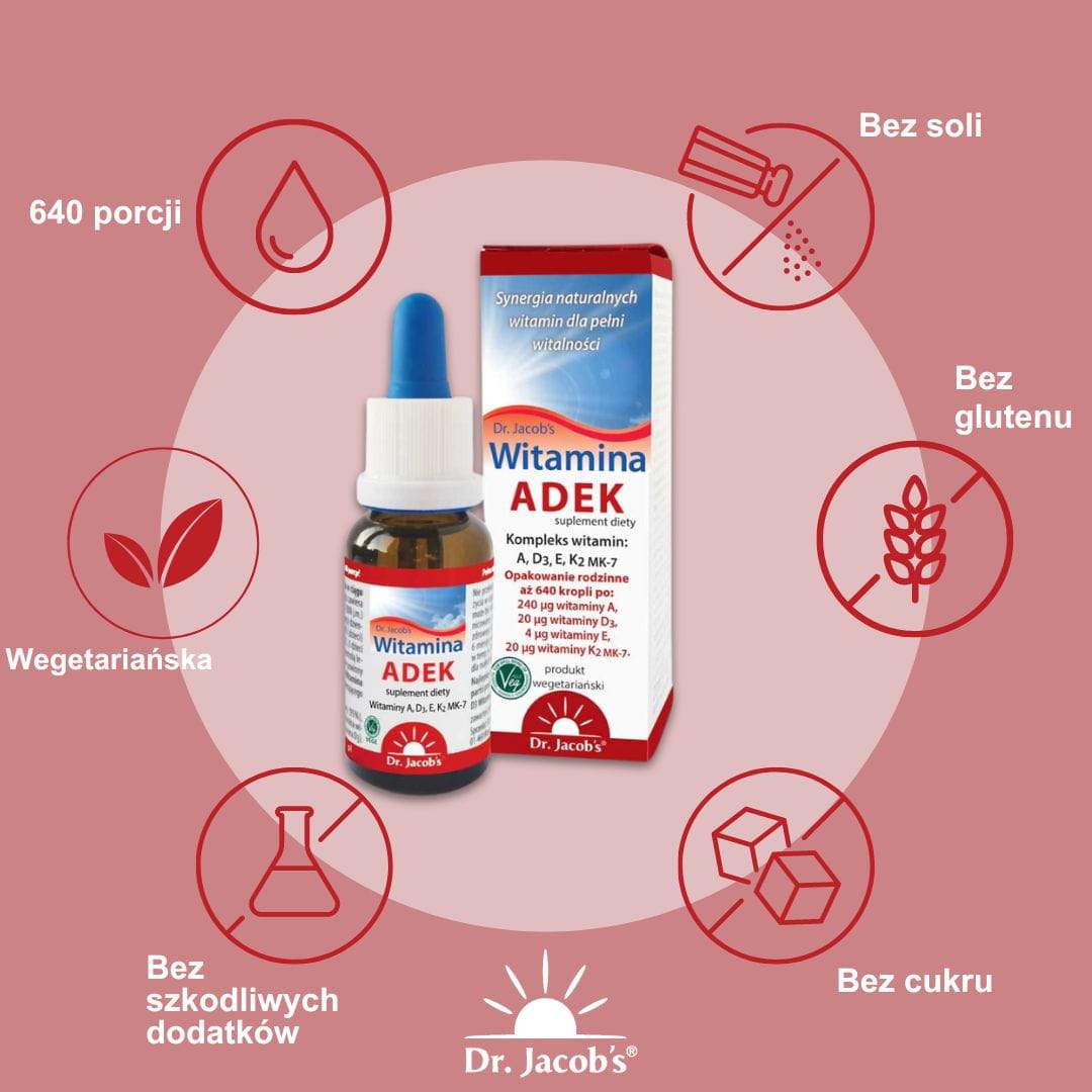 Krople Witamina ADEK Dr. Jacob’s to pierwszy taki produkt na rynku. Dzięki temu, że witaminy są rozpuszczone w oleju, już w ustach wchłaniają się bezpośrednio do krwiobiegu (z pominięciem układu pokarmowego).
