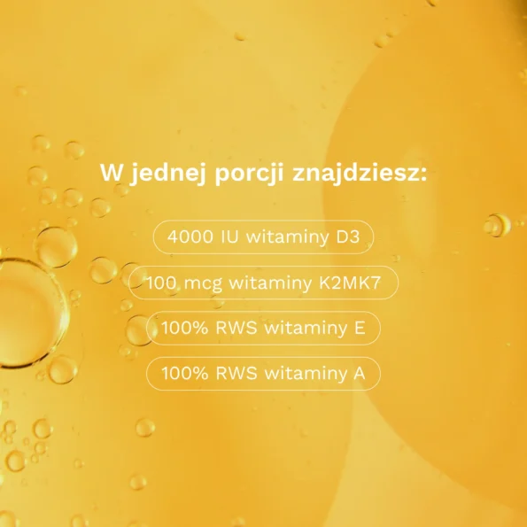Składniki: olej MCT, witamina E (D-alfa-tokoferol), witamina K2MK7 (menachinon-7), witamina D3 (cholekalcyferol), witamina A (palmitynian retinylu), olejek grejpfrutowy.