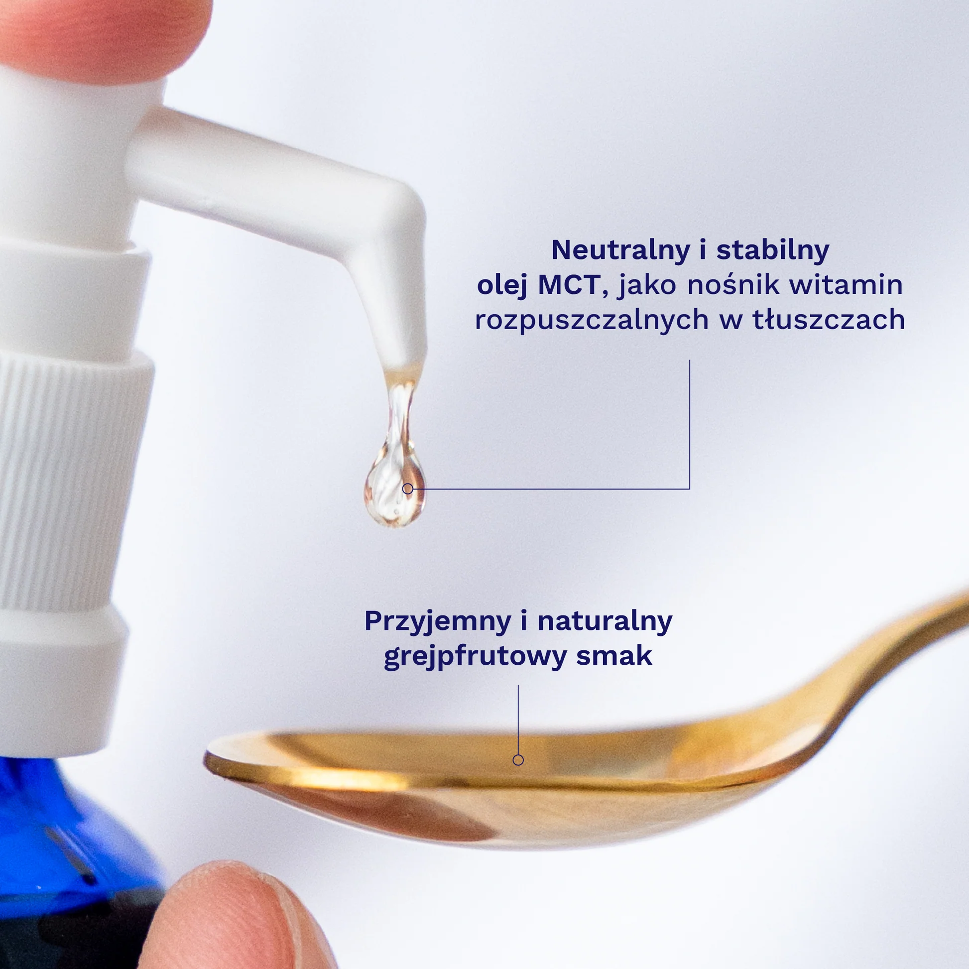 Składniki: olej MCT, witamina E (D-alfa-tokoferol), witamina K2MK7 (menachinon-7), witamina D3 (cholekalcyferol), witamina A (palmitynian retinylu), olejek grejpfrutowy.